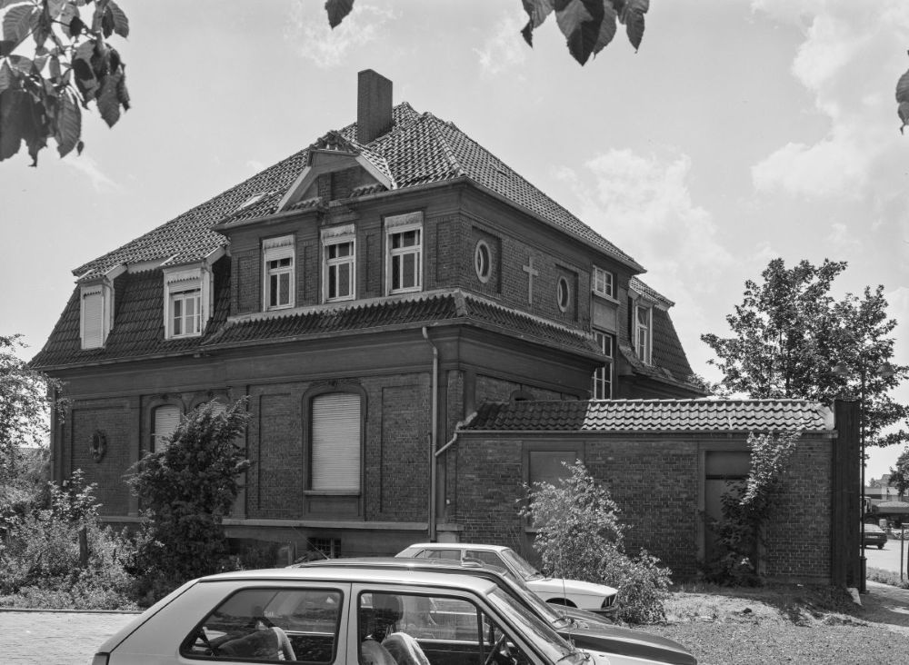 Die Nordseite des St. Emilien-Haus von 1990. Der St. Barbara-Kindergarten wurde 1986 abgerissen. Der niedrige Baukörper Waschraum und Toilettenanlage wurde zu einer nicht benannten Zeit ebenfalls abgebrochen.