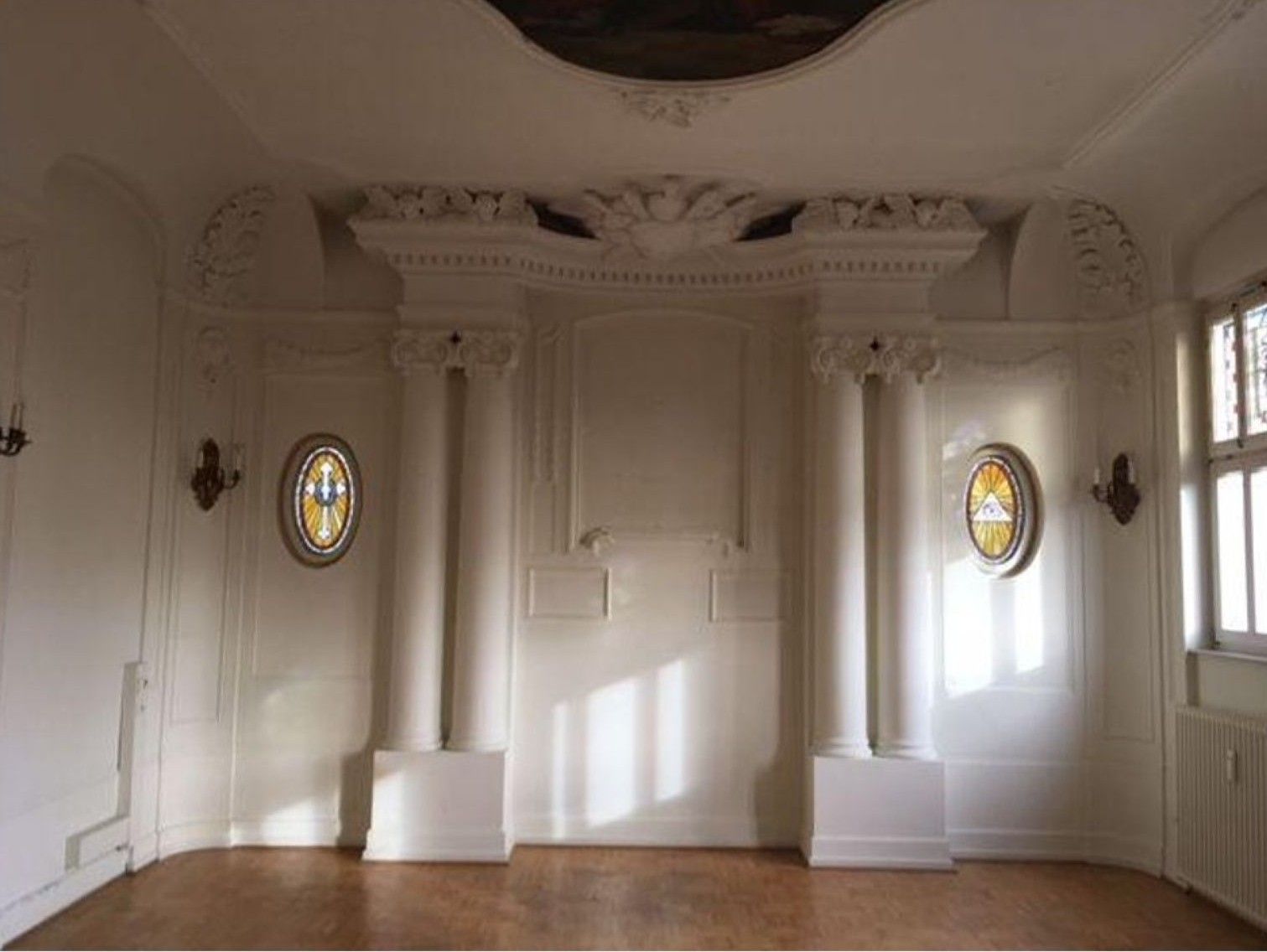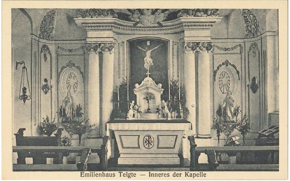 Innenaufnahmen der Hauskapelle in dem Obergeschoss des Emilienhauses um 1918. Zu dieser Zeit waren die Okulifenster links und rechts des Altares noch vermauert.