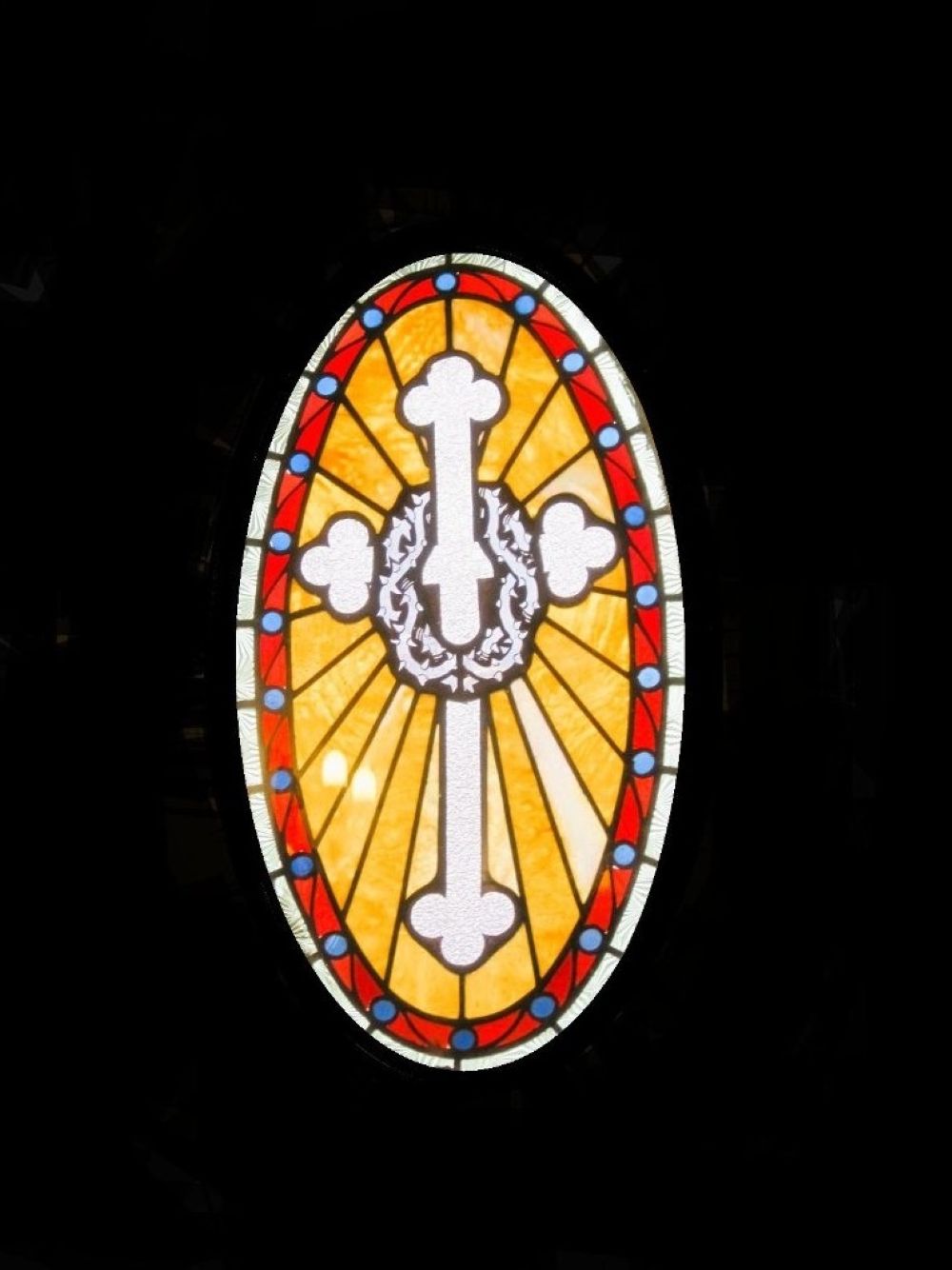 Das linke Okulifenster ist eine unverkennbare Darstellung, bei der die Dornenkrone das Kreuz umwickelt und die Untrennbarkeit von Leiden, Opfer und Erlösung betont. In der Kunst, wie in der Glasmalerei, dient dieses Motiv oft als Andachtsbild, das den Betrachter zum Mitleiden und zur Reflexion über das Opfer Christi bewegen soll.