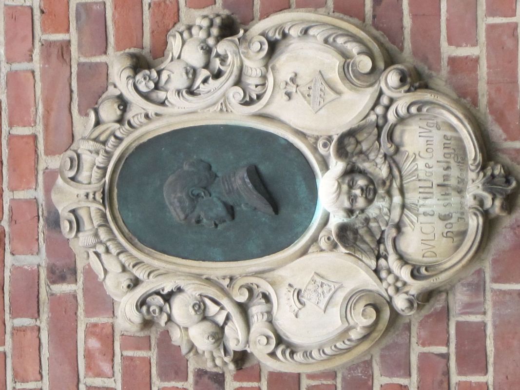 An der rechten Seite des Hauses befindet sich ein Medaillon der Emilie Hötte, der Ehefrau des Stifters, mit dem Chronogramm des Jahres 1918.