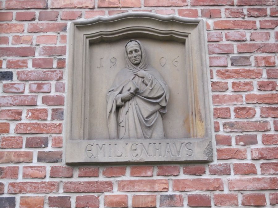Der aufwendig gestaltete Schlussstein auf der Rückseite des Hauses mit einer Abbildung der Namenspatronin Emilie und dem Jahr 1906 wurde einem früher errichteten Gebäude entnommen.