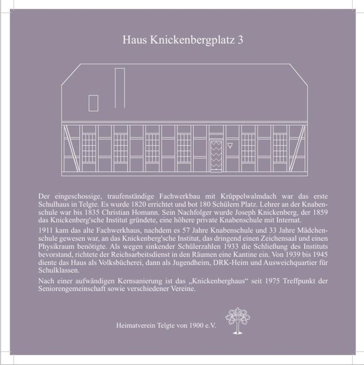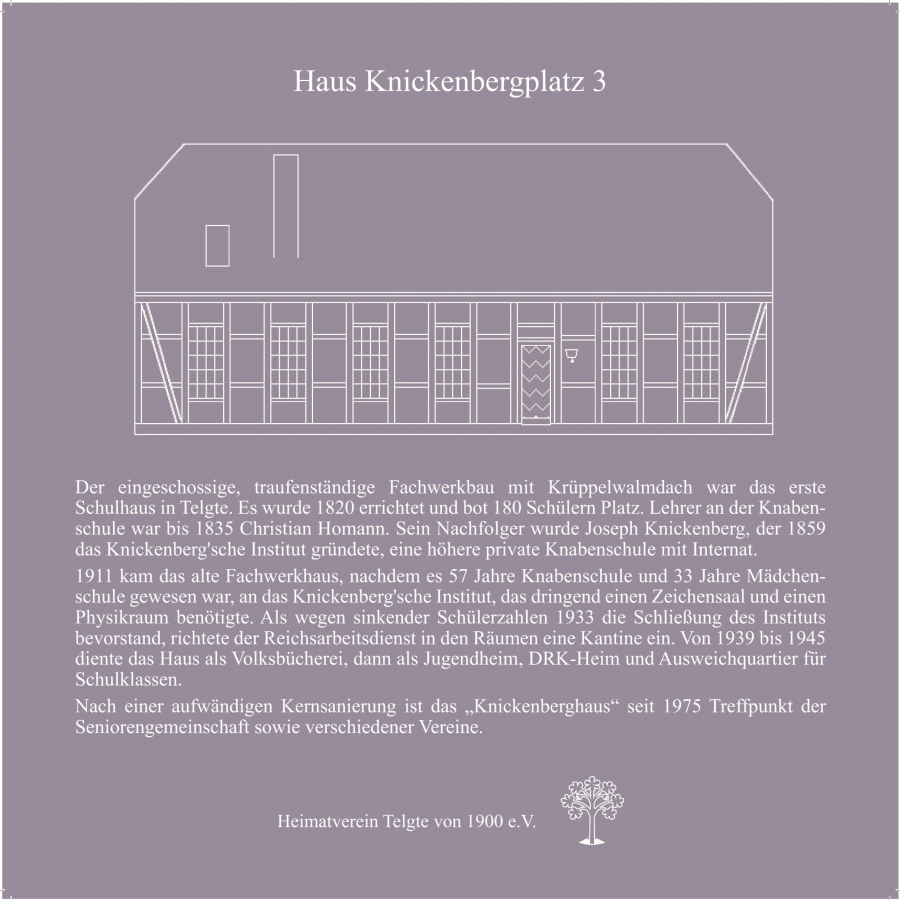 Joseph Knickenberg (1814–1884) ließ um 1845 am heutigen Knickenbergplatz 5 ein kleines, einstöckiges Haus hinter dem bisherigen Knabenschulhaus errichten. Das Gebäude wurde nicht an der Straße errichtet, sondern so gestellt, dass es mit seiner westlichen Vorderfront an den Schulhof hinter dem Knabenschulhaus (Mühlenstraße 3) angrenzte. Es handelt sich um einen Bau aus sichtbar vermauerten Feldbrand-Backsteinen. Das Haus ist für Telgte ein wichtiges baugeschichtliches Zeugnis aus schul- und bildungsgeschichtlicher Sicht. Im Gründungsjahr des Instituts erhielt das Haus im Zusammenhang mit der Gründung der Privatschule Knickenberg ein zusätzliches Stockwerk und rückwärtig einen Anbau als Stallung. Zugleich wurde über dem Satteldach ein Uhrturm aufgestellt, sodass die Schüler auf dem vorgelagerten Schulhof jederzeit die Zeit ablesen konnten. Der schiefergedeckte Turm war ehemals im oberen Bereich offen. Das Uhrwerk ist bis auf das Ziffernblatt nicht mehr vorhanden – um 1980 wurde der Turm mit Kupferblech beschlagen, um weiteres Eindringen von Wasser in das Dach zu verhindern. Auf der Rückseite wurde 1859 ein schmales Wirtschaftsgebäude entlang der südwestlichen Grundstücksgrenze angebaut. Dieses scheint mehrmals erweitert worden zu sein und erhielt dabei später auch ein Obergeschoss, das auch als Nebengebäude der Schule mit unbekanntem Zweck diente. Dieses Hintergebäude wurde 1976 abgerissen. Ab 1976 gab es eine private Initiative zum Erhalt des Gebäudes. „Dabei handelt es sich um einen ersten Versuch in der Stadt, historische Substanz nicht abzubrechen, sondern zu erhalten“, ist in einer Vorlage zu einer Planungsausschusssitzung zu lesen. Zunächst wurde 1976 eine Modernisierung als Gaststätte mit Wohnung geplant. 1978 folgte ein neuer Plan zum Umbau als Galerie und Antiquitätenhandel. Nach einem weiteren Besitzerwechsel wurde das Gebäude 1980 als Wohnhaus ausgebaut und wird bis heute als Wohnhaus genutzt. Die Denkmalschützer des LWL haben das historische Gebäude mit der Denkmalnummer S/57 am 20. Dezember 2018 unter Denkmalschutz gestellt.